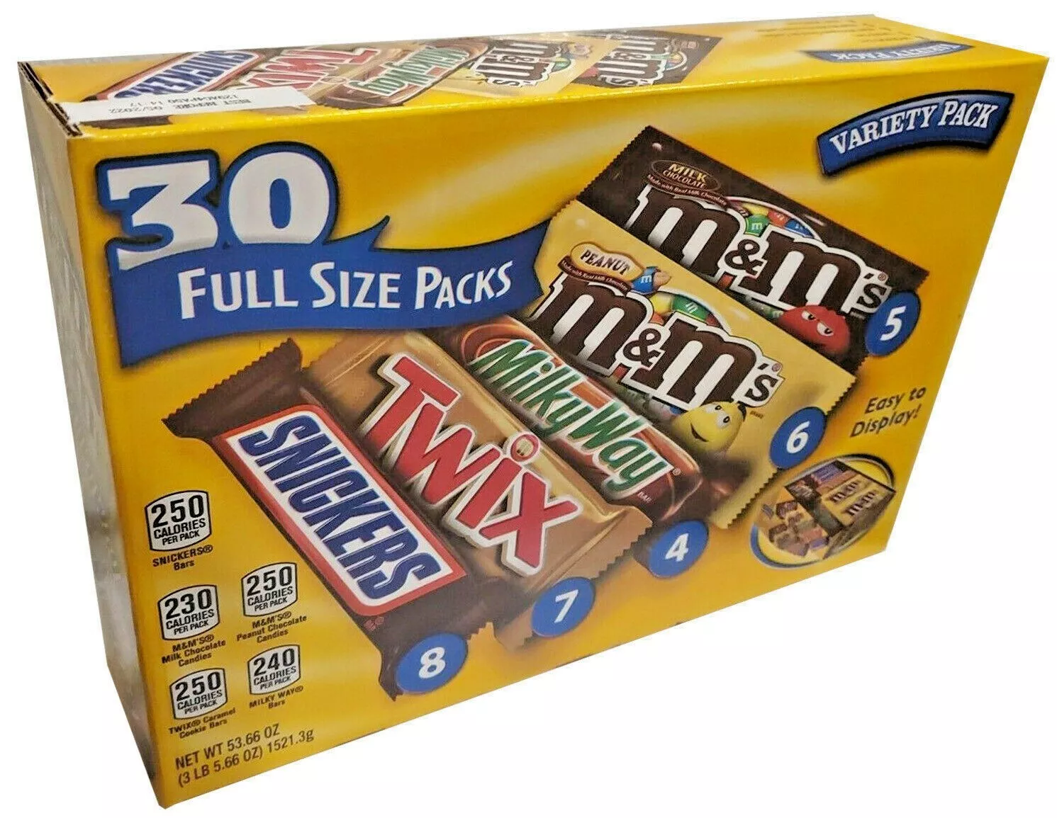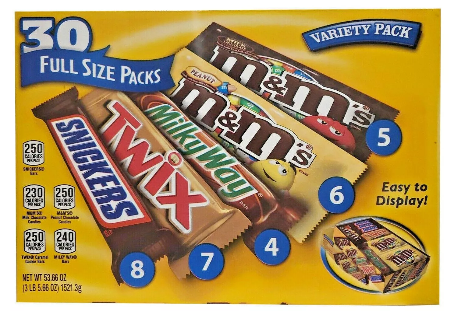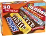 - Contains one (1) 30-count box of full-sized, individually wrapped Chocolate & Chewy Candy: (8) SNICKERS Milk Chocolate Bars, (6) M&M’S Peanut Chocolate Candy, (6) M&M’S Milk Chocolate Candy, (4) SKITTLES Original Chewy Candy, (3) STARBURST Original Chewy Candy, and (3) 3 MUSKETEERS Milk Chocolate Bars Assortment